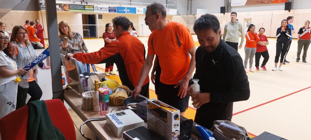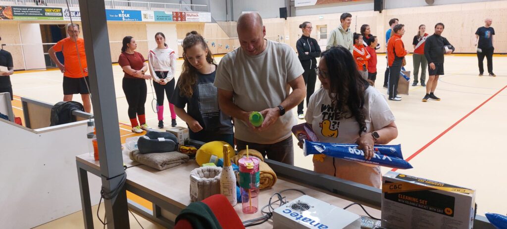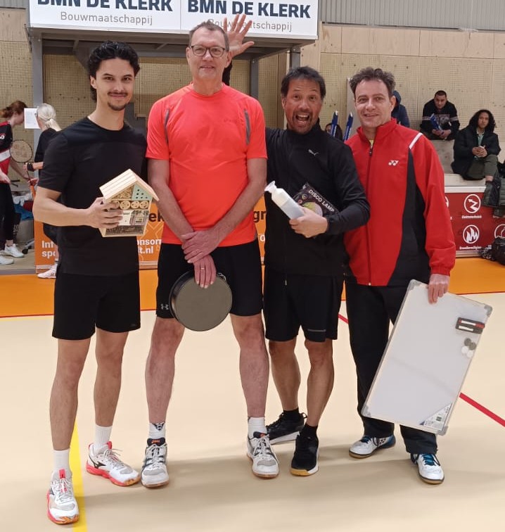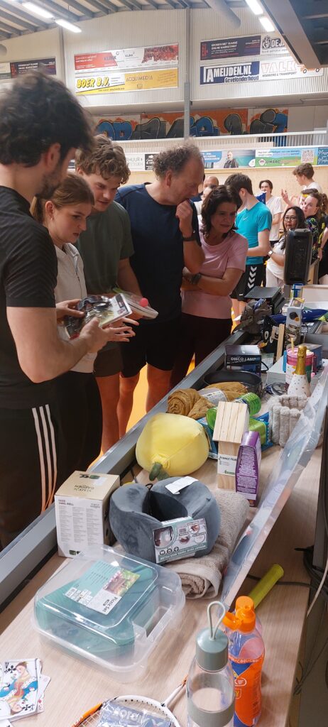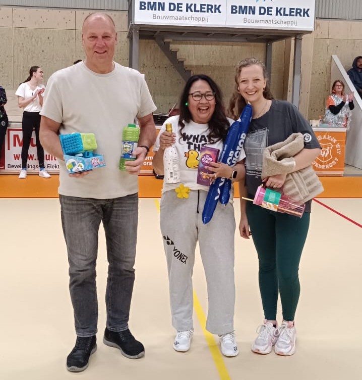 Organisatoren Lene en Teun kondigden de poule winnaars en de winnaars van de originaliteitsprijs voor het mooiste kostuum (Badsm(ax)iton) en de troostprijs (Team Claudia) aan. De winnende teams konden uit een ruime selectie van ‘foute’ prijsjes kiezen. Het team Ilse en de 3 dwergen van ons jeugdlid Mike heeft ook prachtige shirts laten bedrukken maar waren helaas (en begrijpelijk) al naar bed. Zij zullen later op een later moment nog een blijk van waardering voor hun mooie outfits ontvangen.